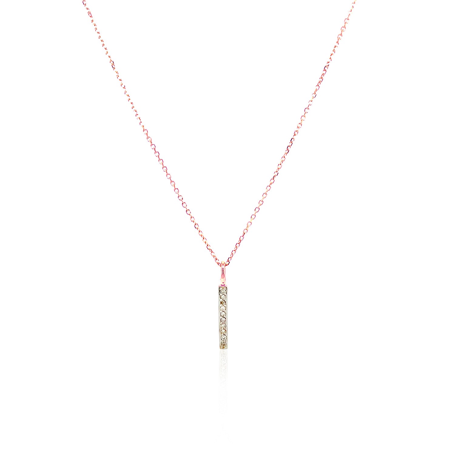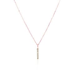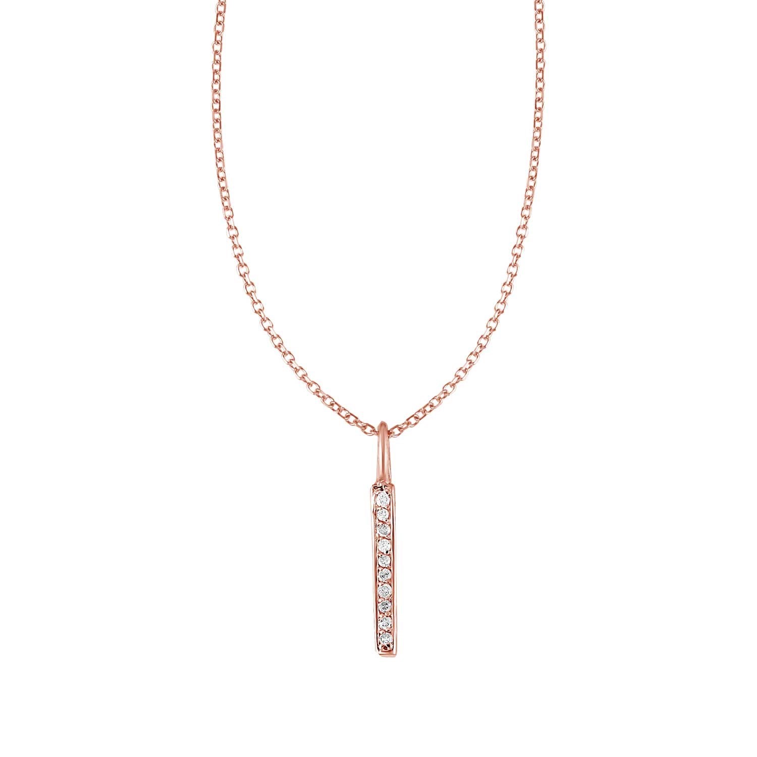 A classic and beautiful bar with diamonds decorates this elegant 14k rose gold pendant. Pendant is 18 inches long and closes with a lobster clasp. Total weight of diamonds is 0.05ct.