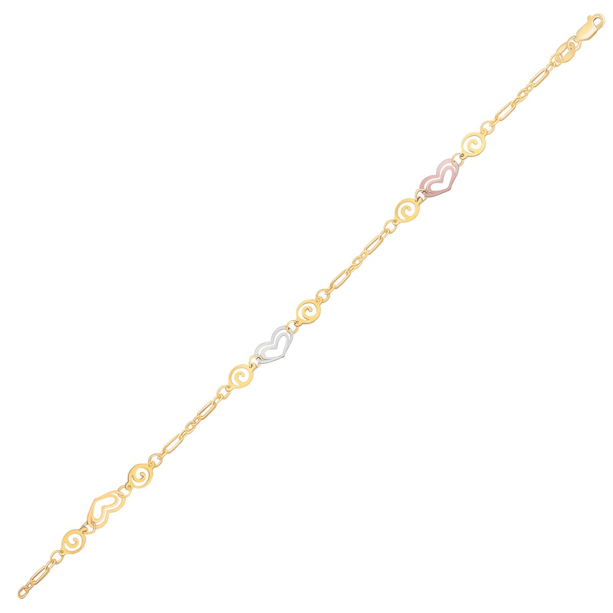 This 10 Inches anklet has many elements to fall in love. These include the heart stations in different tones of 14k white&44; rose&44; and yellow gold and the beautiful spiral designed round shapes. A lovely addition to a jewelry collection secured with a lobster style clasp.