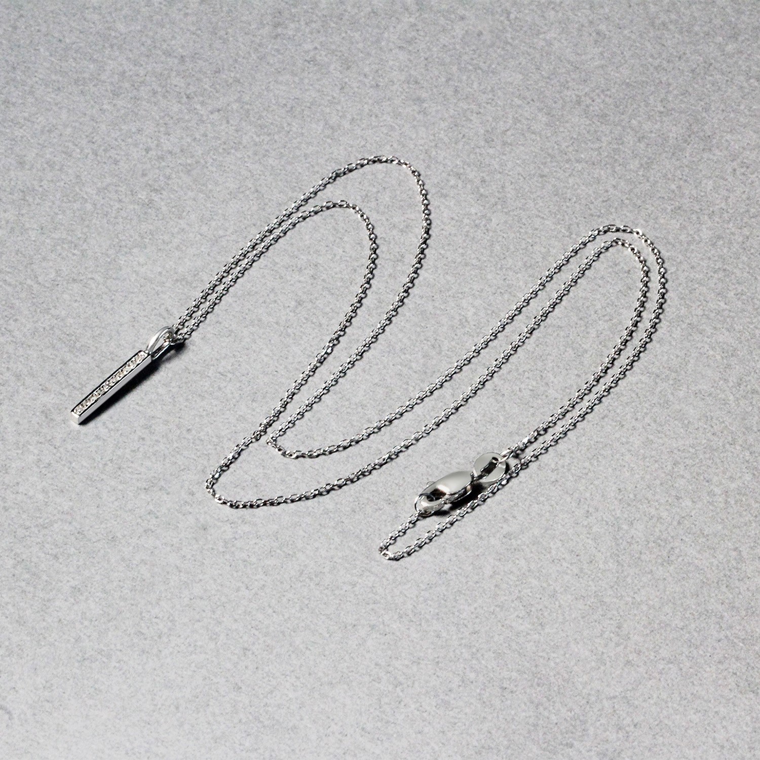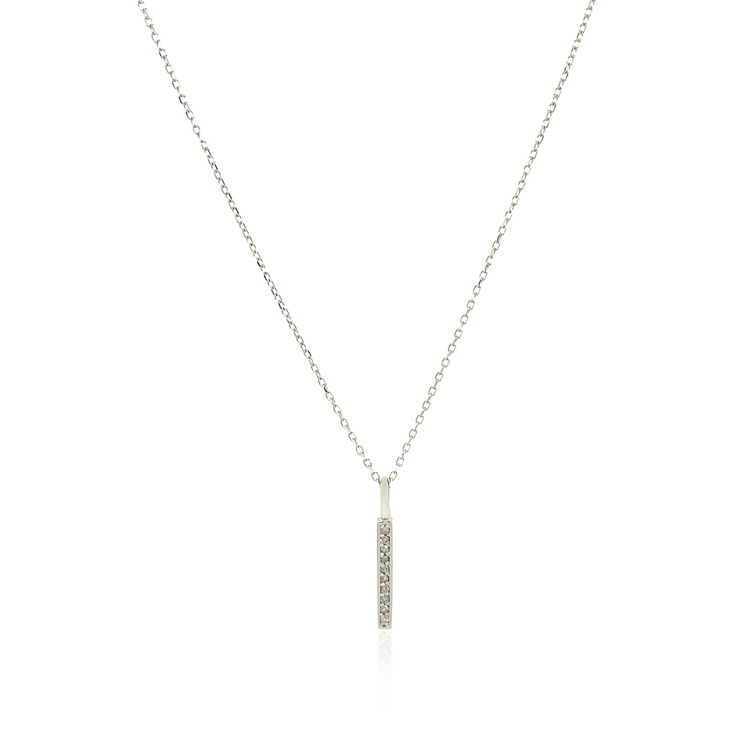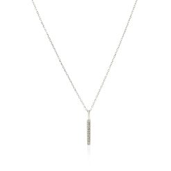 A classic and beautiful bar with diamonds decorates this elegant 14k white gold pendant. Pendant is 18 inches long and closes with a lobster clasp. Total weight of diamonds is 0.05ct.