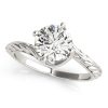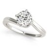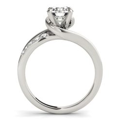 A delightfully designed 14k white gold round diamond ring featuring a bypass style and a band with pave set stones and smooth section detailing.