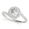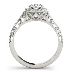 Made of 14k white gold&44; this antique style round diamond ring features a classic halo design with intricate open flourishes along the shanks.