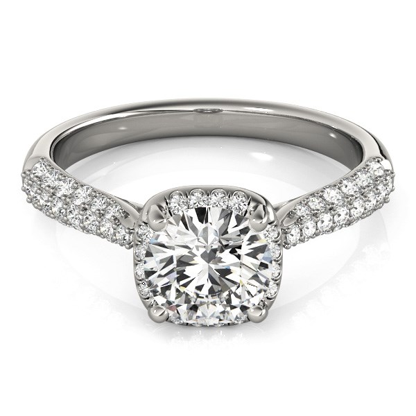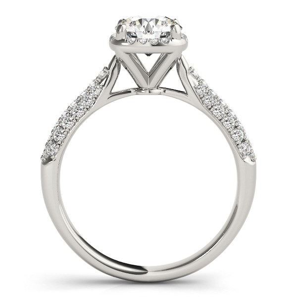A delicate round diamond ring with a halo setting showcasing a graduated pave-set shank&44; this beautifully crafted in 14k white gold.