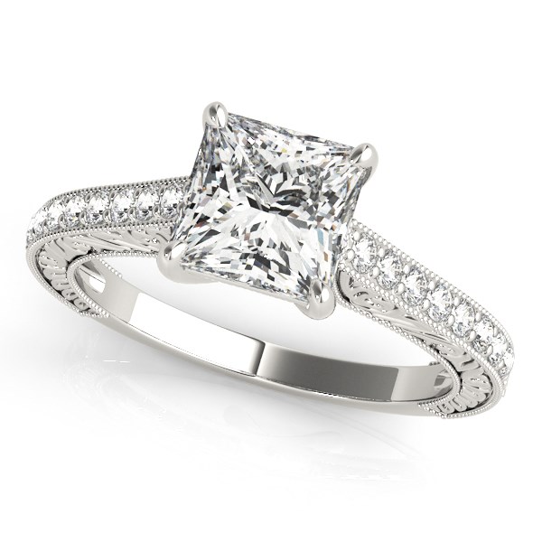 A princess cut prong set ring showcasing flourishes along the side of the shank and a single row of smaller stones. Quite the elegant piece designed in 14k white gold.