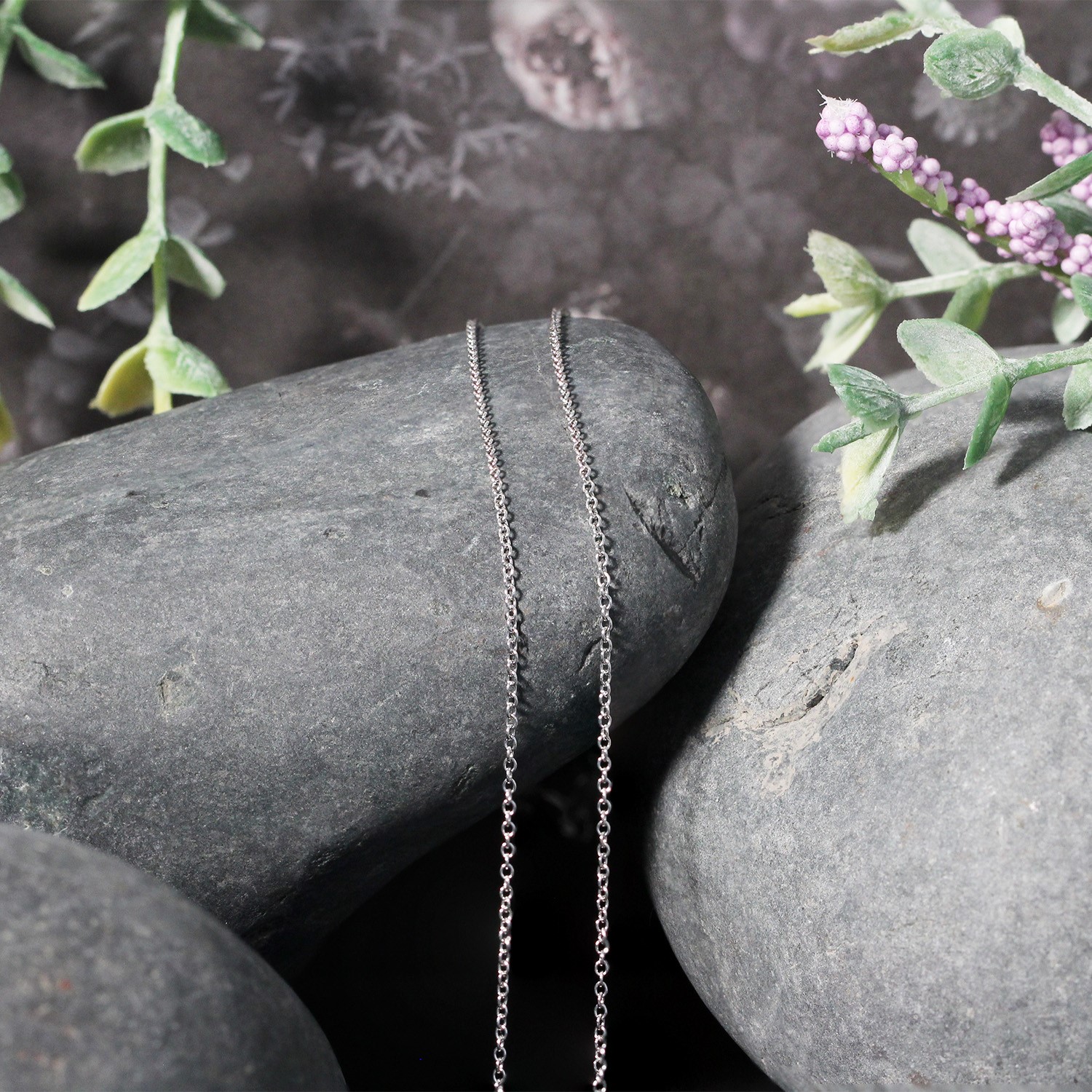 This round cable link chain comes in 14k white gold and has a width of 1.1 millimeters.