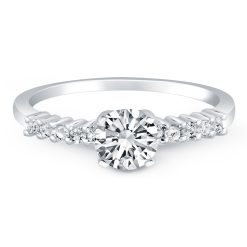 Ten bright diamonds lend a sparkling accent to this elegant engagement ring. The shared prong settings lead the eye to the center diamond. Expertly crafted in 14k white gold&44; the center highlights a sparkling 1/2 carat round cut diamond.