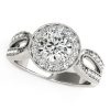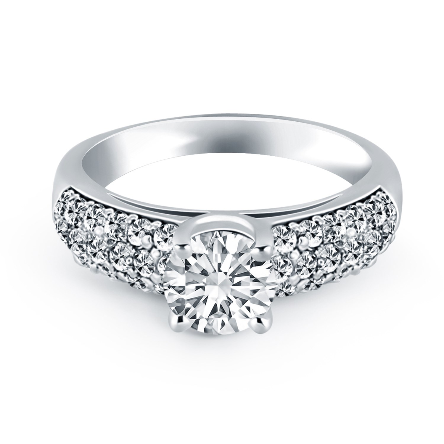 This dramatic ring is encrusted with three rows of glittering pave diamonds. The classic cathedral silhouette is amplified by the impressive width which culminates into a graceful taper. Expertly crafted in 14k white gold&44; the center highlights a sparkling 1/2 carat round cut diamond.