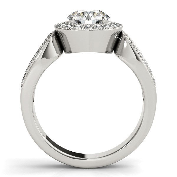 A stunning round cut diamond engagement ring with pave set diamonds on the halo and along the teardrop shape split shank showcasing milgrain edge detailing&44; this ring made of 14k white gold.