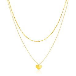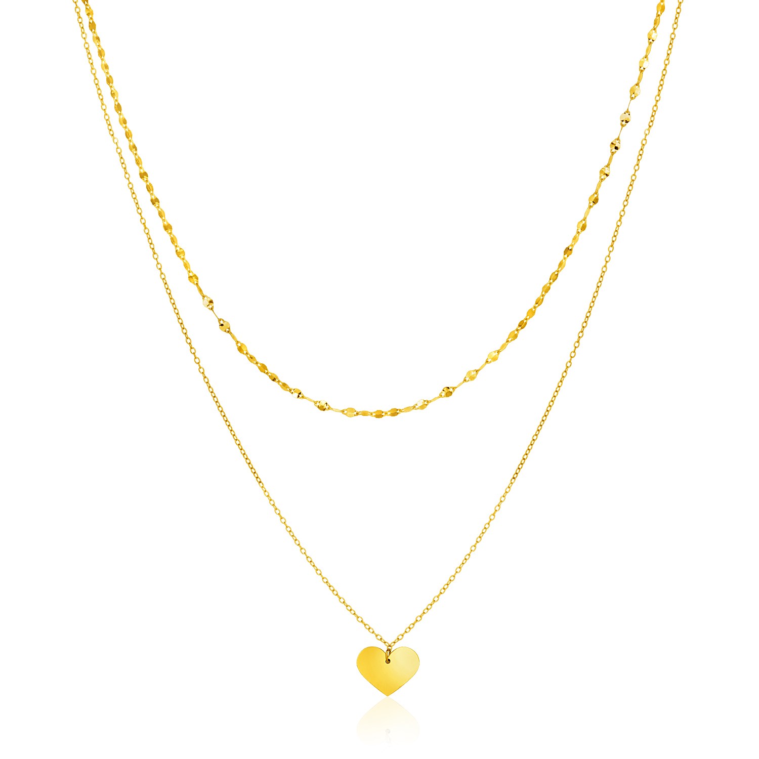 Two strands of elegant 14k yellow gold chain&44; one featuring intriguing texture and the other adorned with a shiny heart pendant&44; combine beautifully in this heartfelt and timeless necklace. Necklace is 18 inches long and closes with a lobster clasp.