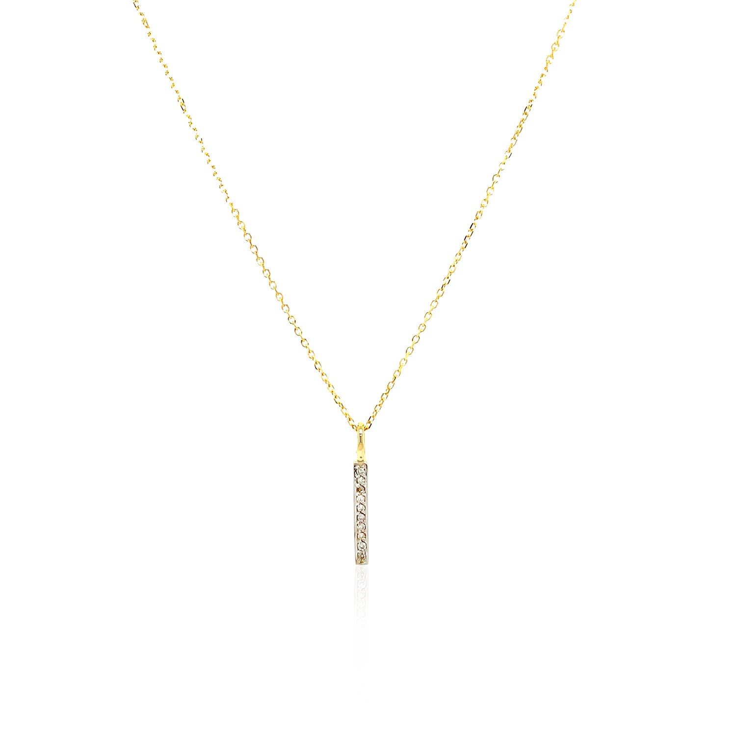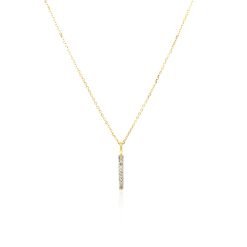 A classic and beautiful bar with diamonds decorates this elegant 14k yellow gold pendant. Pendant is 18 inches long and closes with a lobster clasp. Total weight of diamonds is 0.05ct.