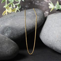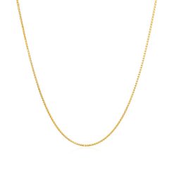This diamond cut round wheat chain comes in 14k yellow gold and has a width of 0.6 millimeters.