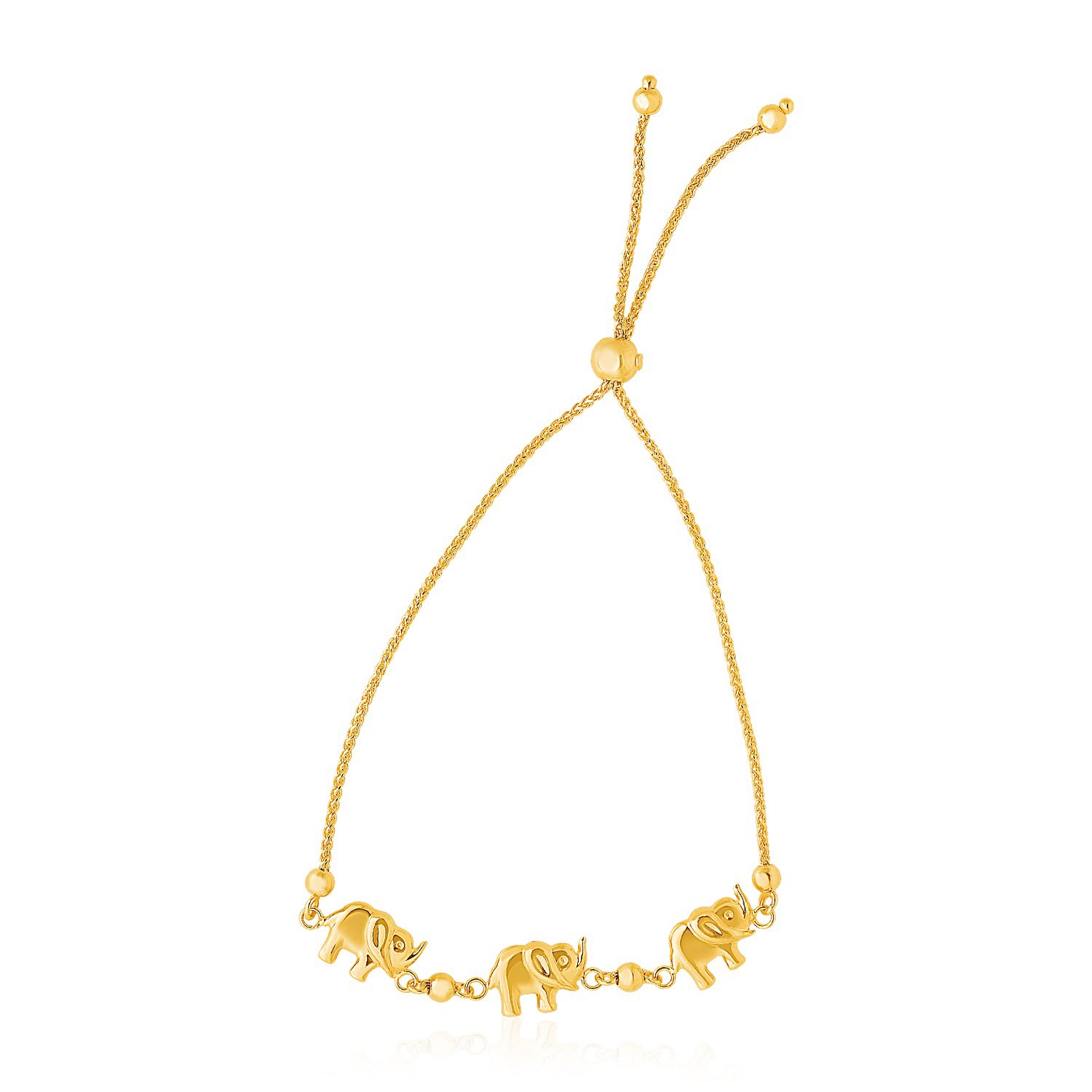 This darling chain bracelet features three elephants and bead detailing. Made of 14k yellow tone gold&44; this showcases a lariat style drawstring closure.