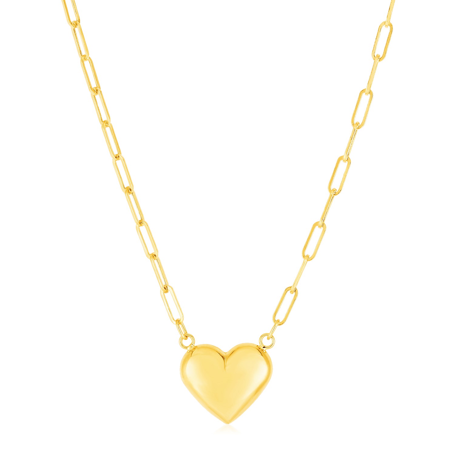 14k Yellow Gold Paperclip Chain Necklace with Puffed Heart