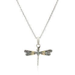 The simple bail provides a beautiful contrast to the exquisitely designed dragonfly with 18k yellow gold and scrollwork wings of this pendant. Crafted in fine sterling silver.