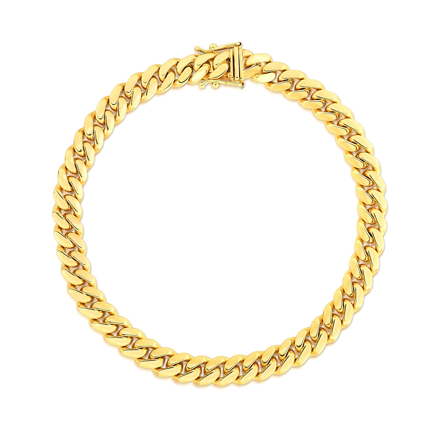 This Classic Miami Cuban solid bracelet comes in 14k yellow gold and has a width of 7.0 millimeters. Secured with a box clasp.