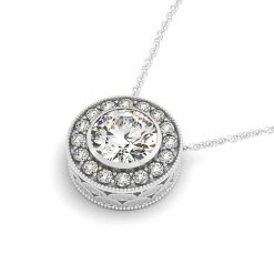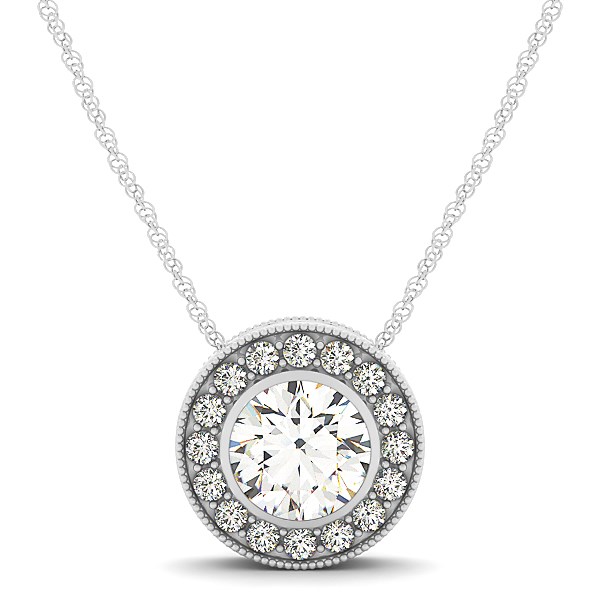 Smooth and milgrain edge beautifully highlight the bezel set 1/2 carat center diamond. This diamond halo pendant is crafted in 14k white gold.
