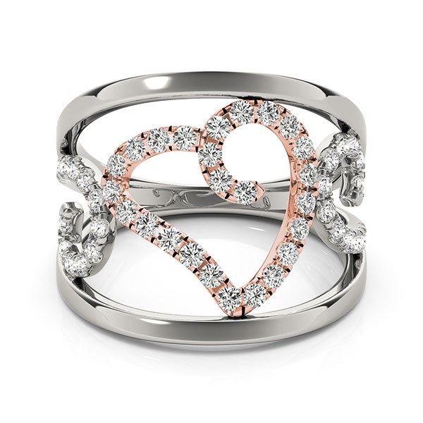 This 14k gold ring showcases a filigree motif and rose gold swirly heart design with round shape diamonds.
