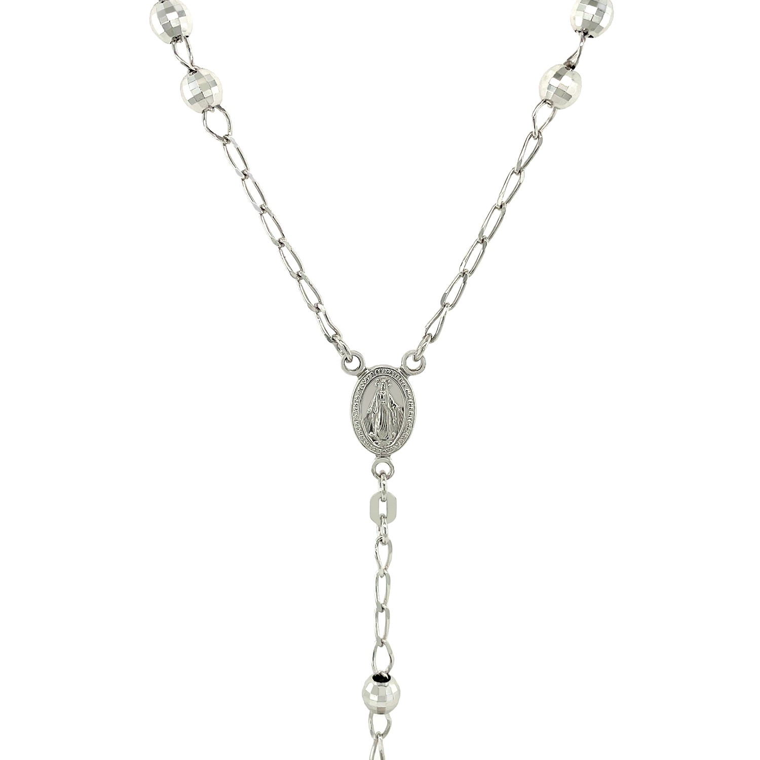 Large polished beads adorn this classic sterling silver rosary necklace. Necklace is 26 inches long.