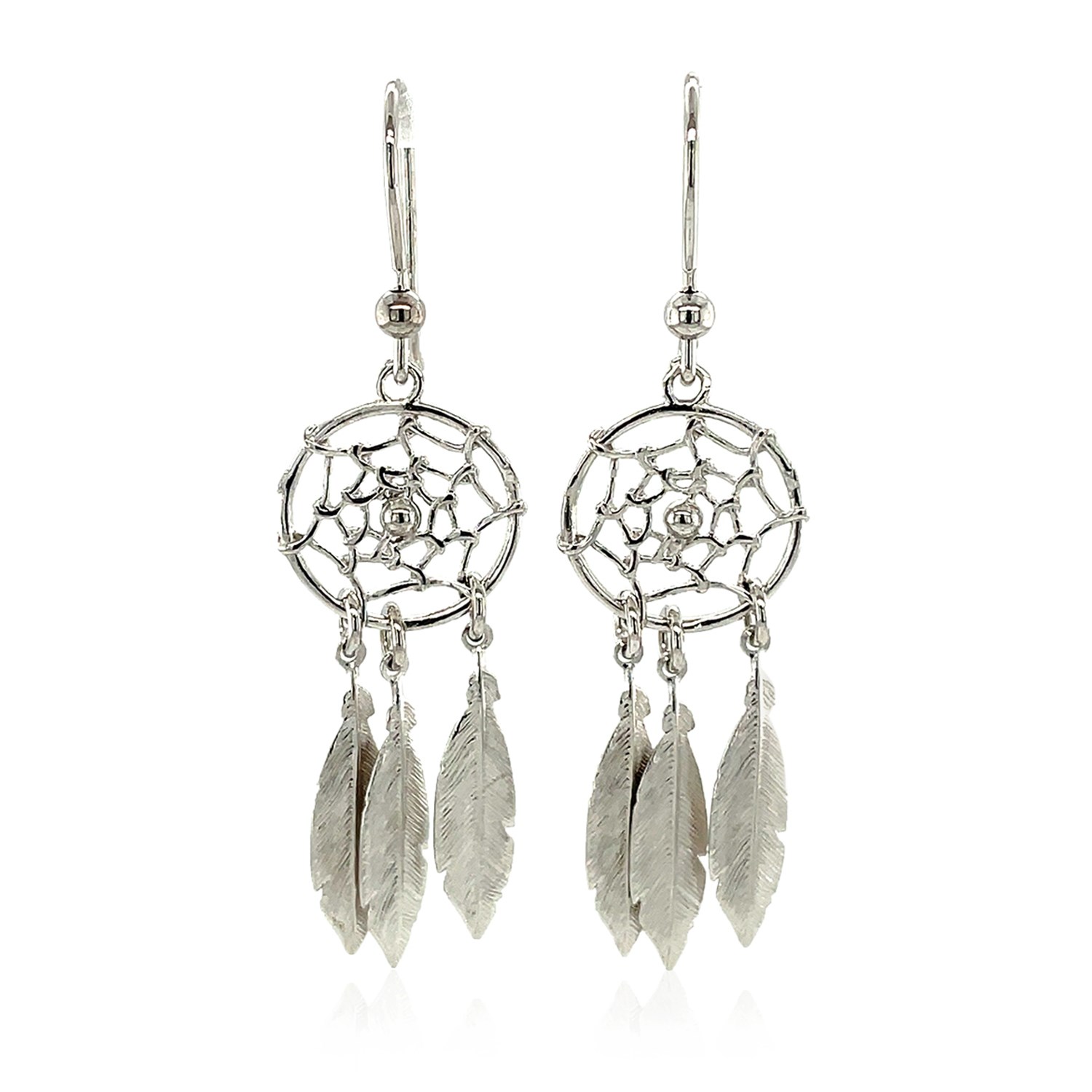 Playful dream catchers with textured feathers swing and shine as they hang from these lovely sterling silver earrings. Earrings hang from Euro wires.