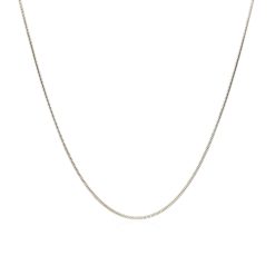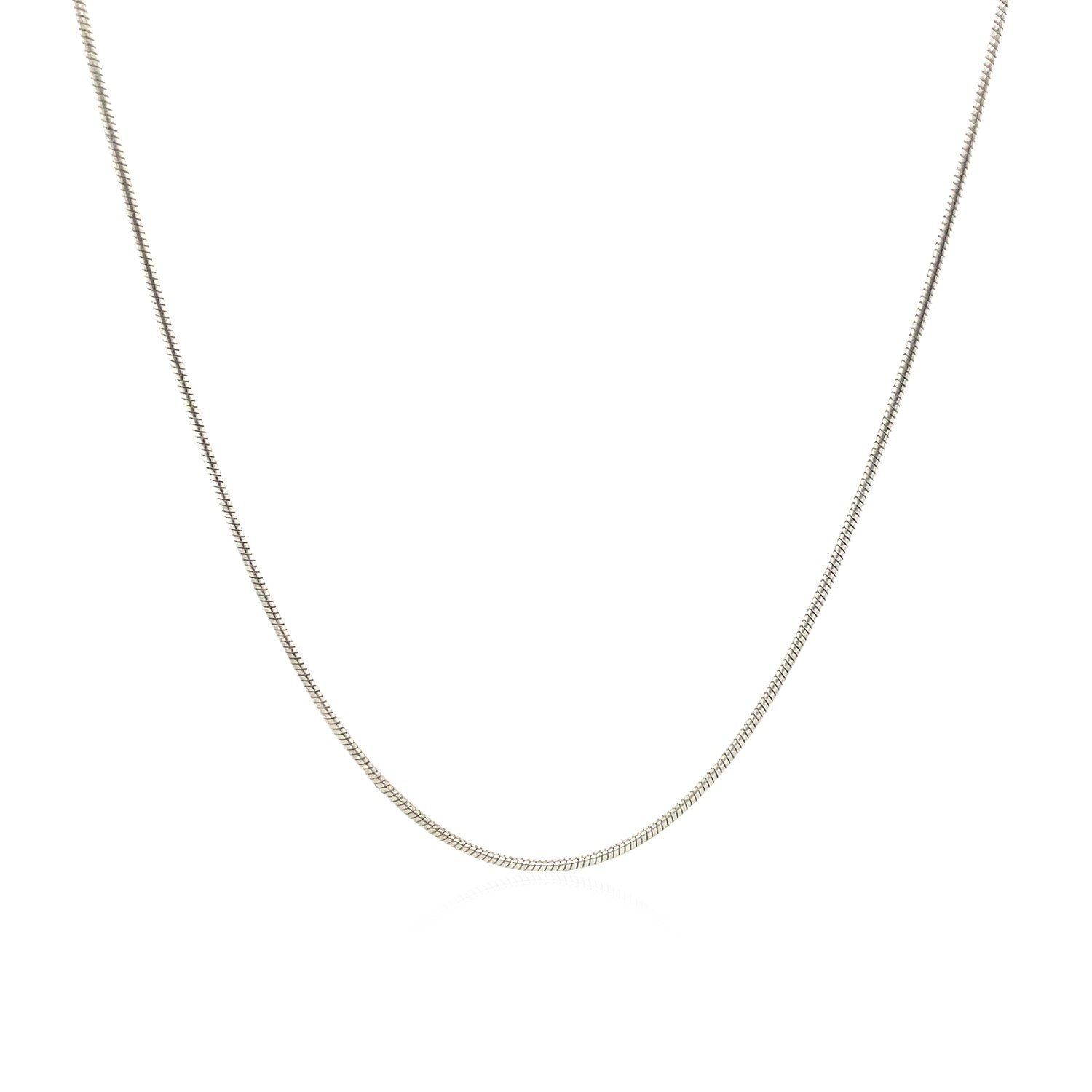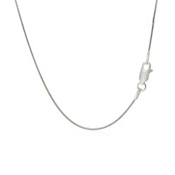 This rhodium-plated snake chain comes in sterling silver and has a width of 0.9 millimeters.