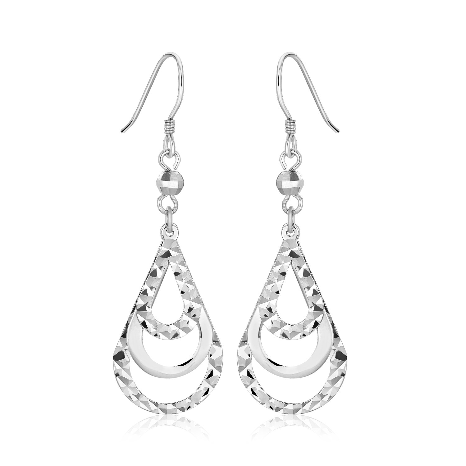 Three open graduated teardrops showcase alternate smooth and textured detailing on these stylishly unique dangling earrings. Crafted in rhodium plated sterling silver&44; these are secured with french hooks.